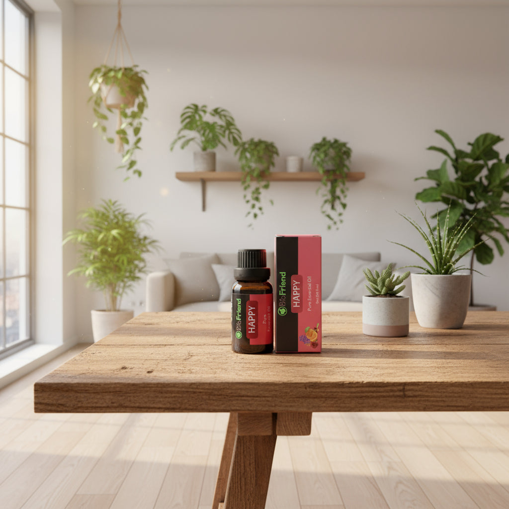 Tilsett 5–10 dråper av BioFriend Happy i din favorittdiffuser for et naturlig løft i humør og energi.