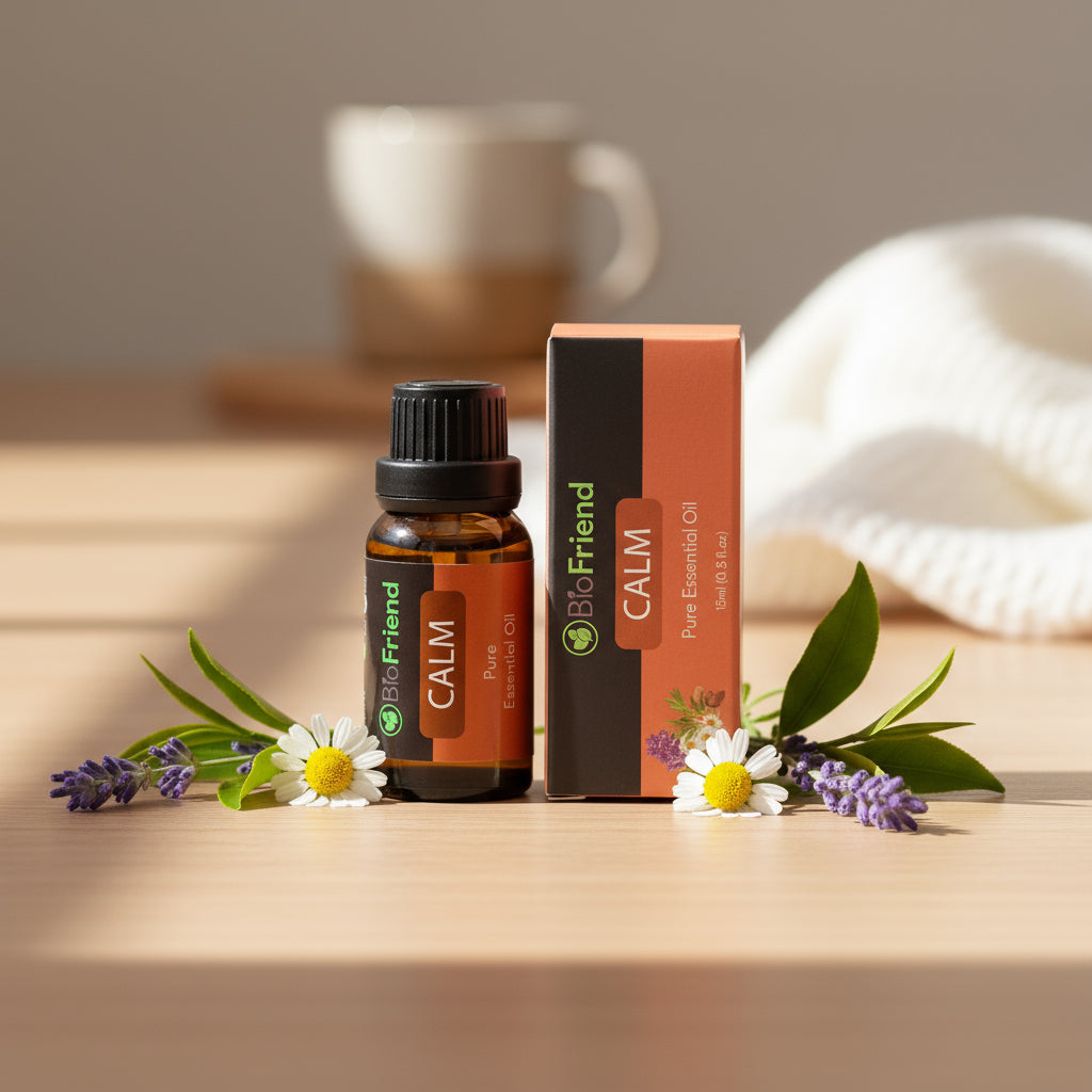 BioFriend Calm er en harmonisk blanding av lavendelolje, kamomilleolje, tetreolje og mandelolje, nøye utvalgt for å bidra til ro, klarhet og stressreduksjon. Denne naturlige aromaterapiblandingen hjelper kroppen å senke pulsen og roe sinnet etter en travel dag – på helt naturlig vis.